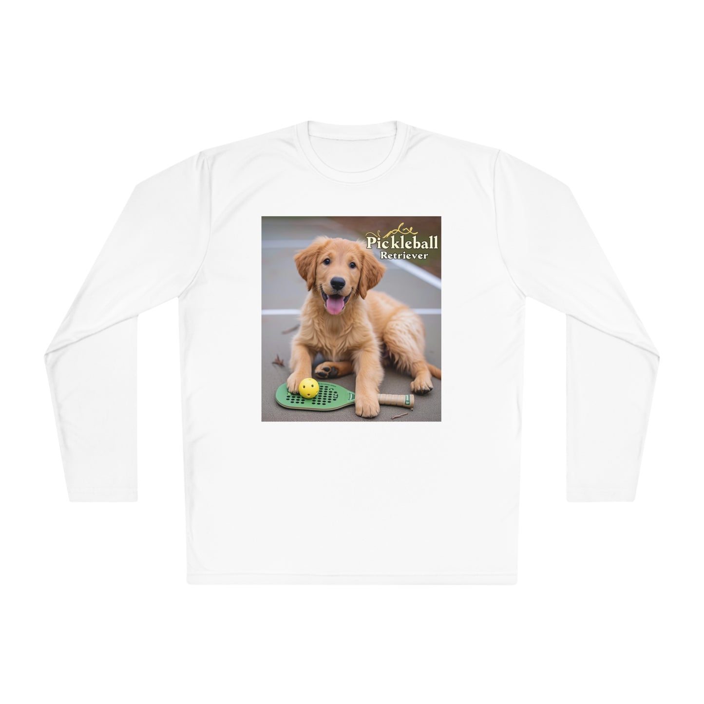 Bring joy to the court with our "Pickleball Pup Partner" Performance Long Sleeve Tee. This top is a must-have for those who don't just love the game but also cherish their canine companions. With the adorable golden retriever design, this shirt is perfect for anyone who believes in the fun and fellowship of Pickleball.