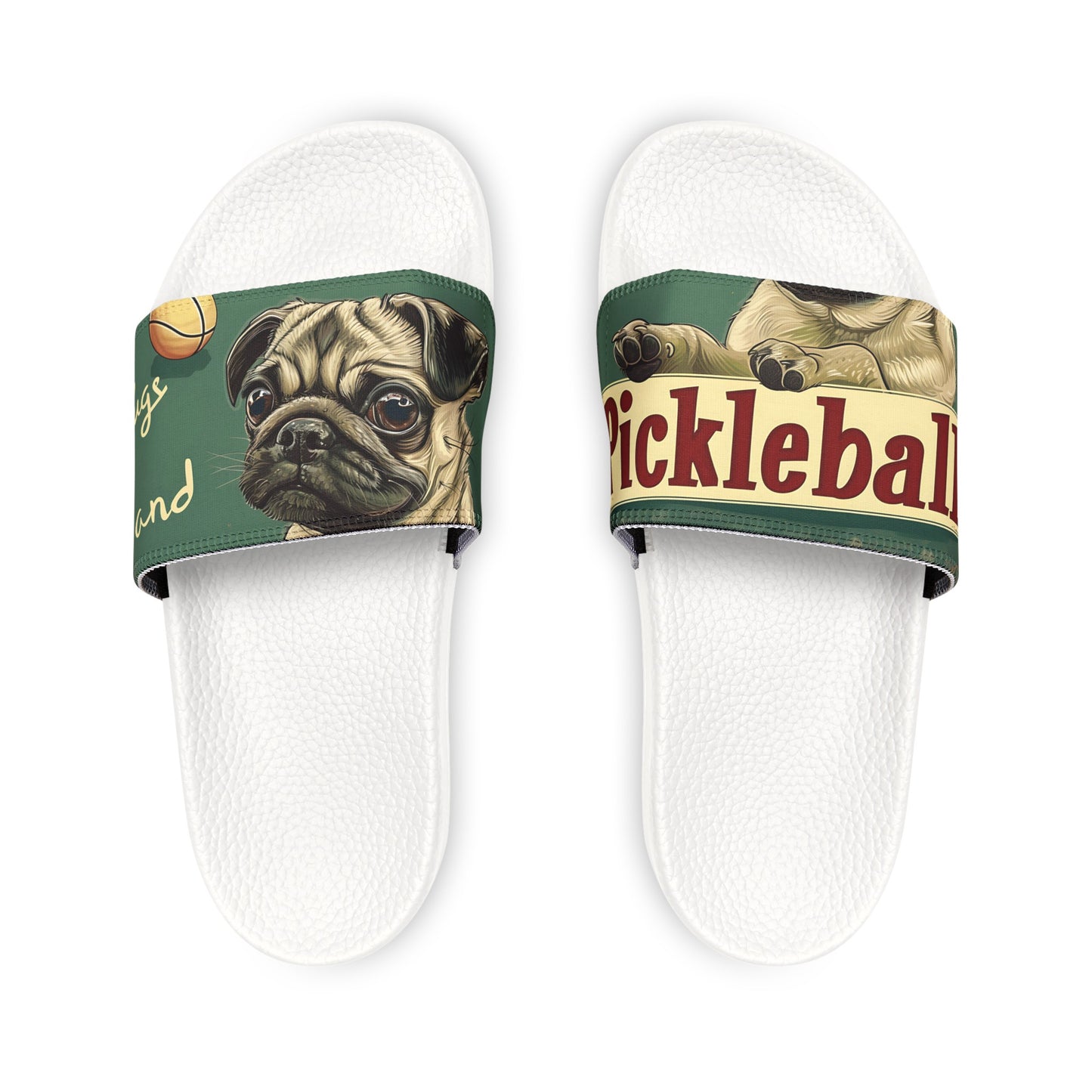 Stride onto the court or into your day with our "Pugs and Pickleball Slide Sandals for Women," the ideal footwear for those who adore both their pug and pickleball. These sandals combine fun design with practical comfort, perfect for the pickleball enthusiast and dog lover.